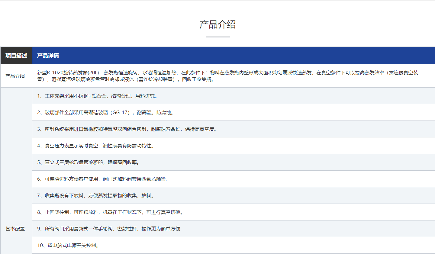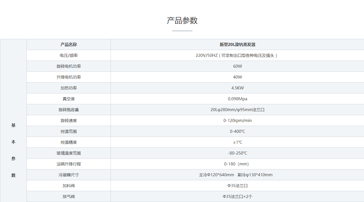 新型R-1020旋轉蒸發器(20L),蒸發瓶恒速旋轉,水浴鍋恒溫加熱,在此條件下:物料在蒸發瓶內壁形成大麵積均勻薄膜快速蒸發,在真空條件下可以提高蒸發效率(需連接真空裝置),溶媒蒸汽經玻璃冷凝盤管時冷卻成液體(需連接冷卻裝置),回收於收集瓶。