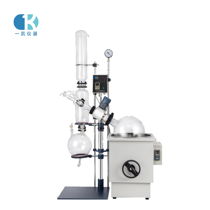 RE-2002旋轉蒸發器(20L),蒸發瓶恒速旋轉,水浴鍋恒溫加熱,在此條件下:物料在蒸發瓶內壁形成大麵積均勻薄膜快速蒸發,在真空條件下可以提高蒸發效率(需連接真空裝置),溶媒蒸汽經玻璃冷凝盤管時冷卻成液體(需連接冷卻裝置),回收於收集瓶。